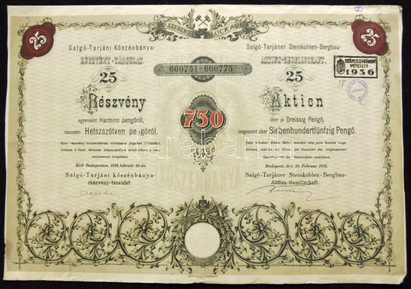 1936. Salgó-Tarjáni Kőszénbánya Részvény-Társulat részvénye 750P-ről s...