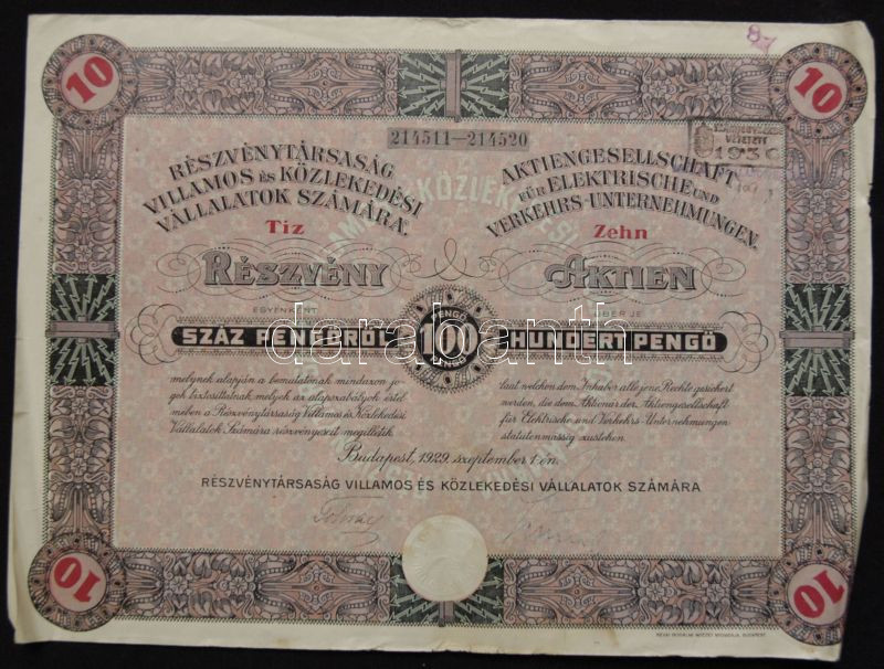 https://www.darabanth.com/en/152-Online-auction/152.0/Numismatics/Shares-Securities-and-Tickets~700008/Budapest-1929-Reszvenytarsasag-Villamos-es-Kozlekedesi-Vallalatok-szamara-10-reszveny~II472815