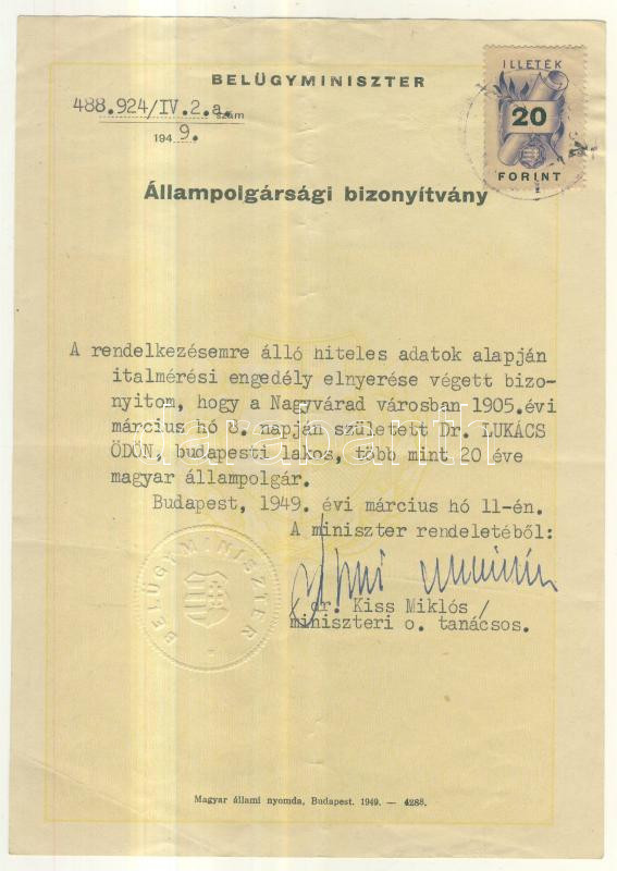 1949. Magyar állampolgársági bizonyítvány okmánybélyeggel és Kossuth-címeres szárazbélyegzővel