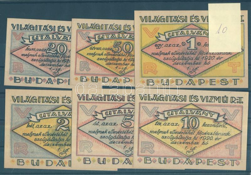 Budapest 1920. "Világítási és Vízmű R.T." 20f, 50f, 1K, 2K, 5K, 10K T:I