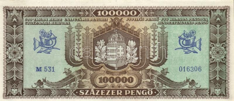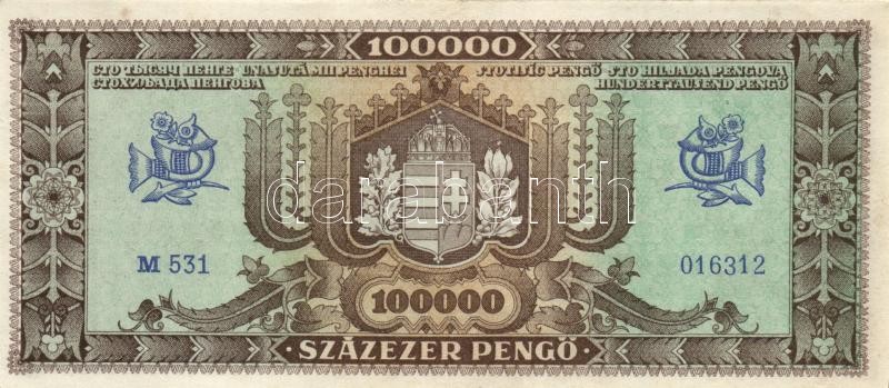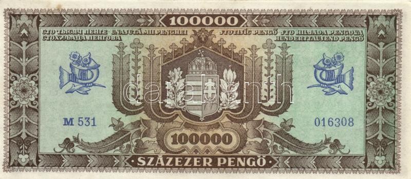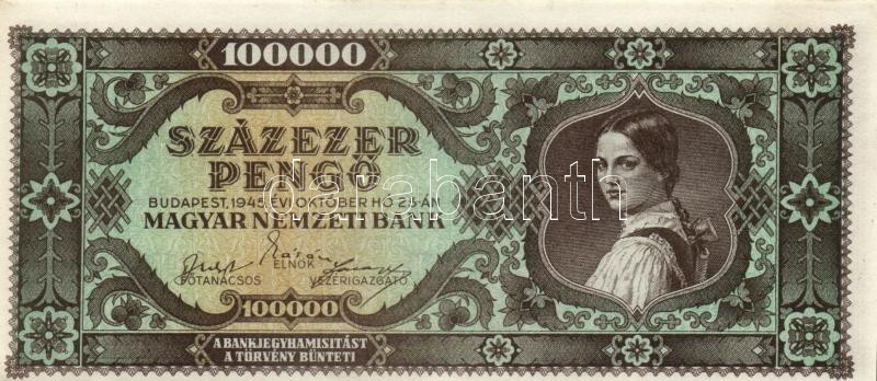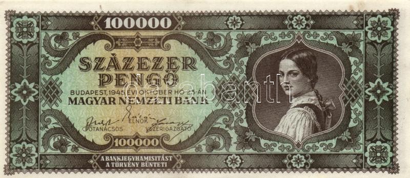 1945. 100.000P (3x) eltolódott nyomattal,egyugrású és közeli sorszámmal T:I-
