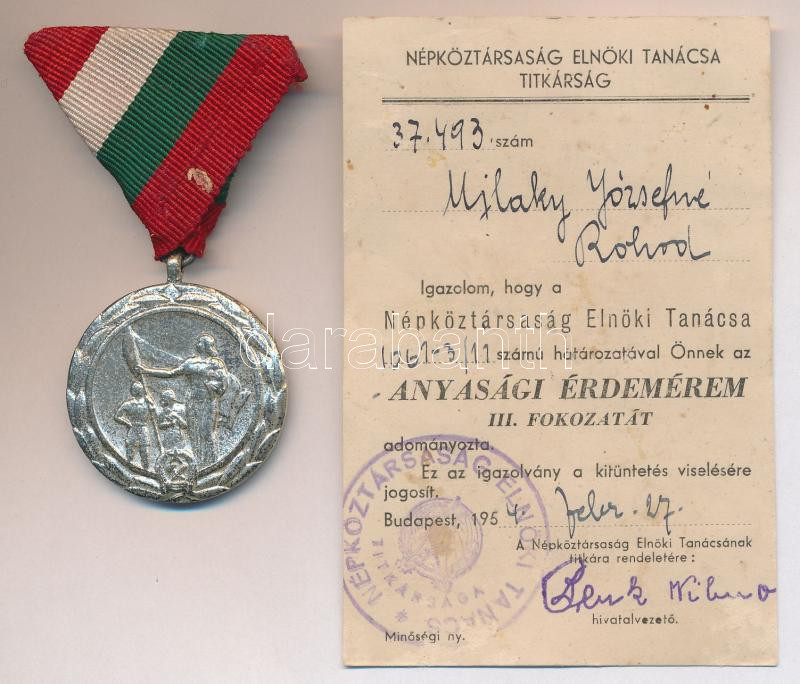 https://www.darabanth.com/en/154-Online-auction/154.0/Numismatics/Hungarian-commemorative-medals-plaques-badges~6000317/1954-Anyasagi-Erdemerem-III-Fokozata-eredeti-disztokban-es-adomanyozoi-okirattal-T2-~II477673