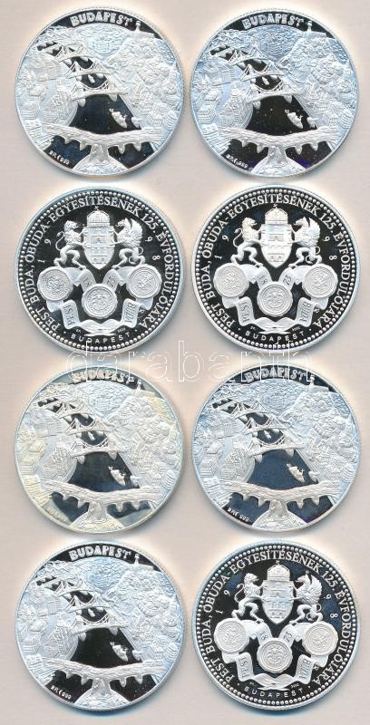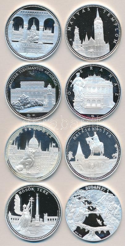 Komplett 8db-os Ag "Budapest" emlékérme sorozat eredeti bársony dísztokban, tanúsítvánnyal! Br.: 248.8g/0.999! T:PP Csak 1000db!