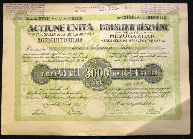 1923. Arad-Mezőgazdák Kereskedelmi Részvénytársaság egyesített részvénye 3000L-ről 300L bélyegzővel, magyar és román nyelven, szelvényekkel