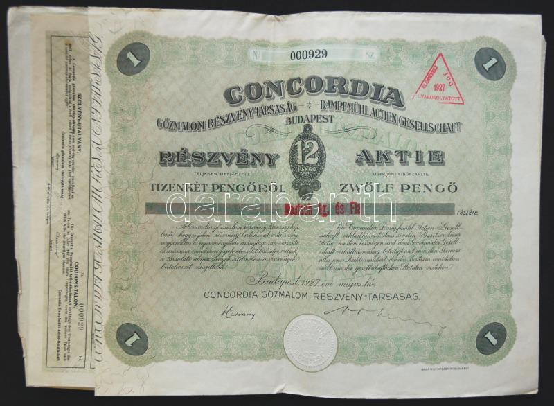 1927. "Concordia Gőzmalom Részvénytársaság" részvénye 12P-ről, magyar ...