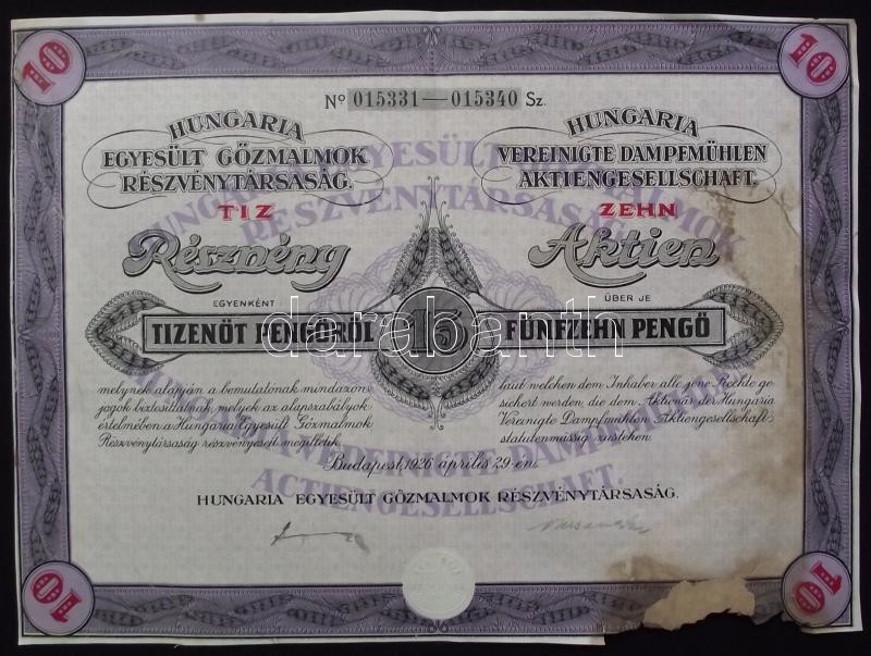 Budapest 1926. "Hungaria Egyesült Gőzmalmok Részvénytársaság" részvénye 15P-ről szelvényekkel szárazpecséttel (kis papírhiány)