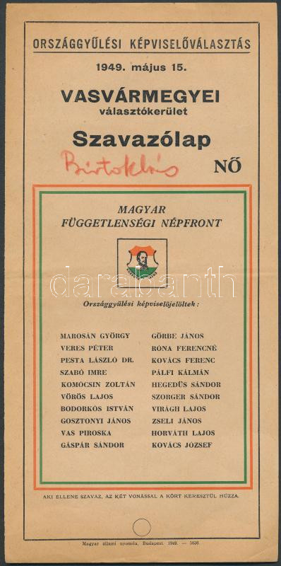 1949 Országgyűlési választás Függetlenségi népfront női szavazólap Vasvármegye