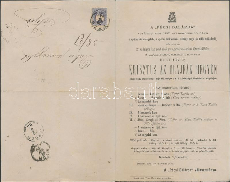 1885 Pécsi Dalárda meghívója és programja a Beethoven Krisztus az Olaj...
