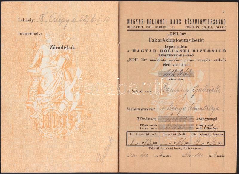 1943 Magyar-Hollandi Bank Takarékbiztosítási könyvecske