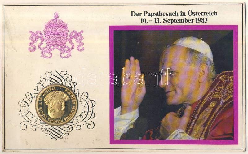 Ausztria 1983. "II. János Pál pápa látogatása Ausztriában" aranyozott ... https://www.darabanth.com/en/155-Online-auction/155.0/Numismatics/Foreign-precious-commemorative-medals-plaques-badges~5000352/Ausztria-1983-II-Janos-Pal-papa-latogatasa-Ausztriaban-aranyozott-fem-emlekerem-35mm-~II486102