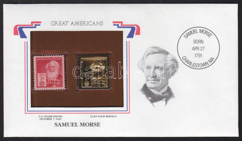 USA/"Nagy Amerikaiak" 1940. "Samuel Morse- 22K aranyfóliás bélyeg repl... https://www.darabanth.com/en/155-Online-auction/155.0/Numismatics/Foreign-precious-commemorative-medals-plaques-badges~5000352/USANagy-Amerikaiak-1940-Samuel-Morse-22K-aranyfolias-belyeg-replika-es-belyeg-boritekba~II485338