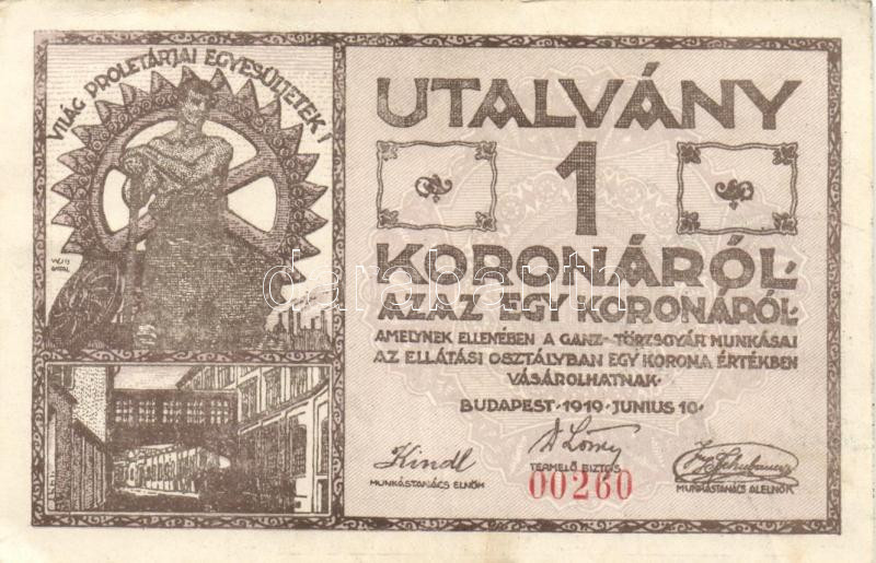 https://www.darabanth.com/en/155-Online-auction/155.0/Numismatics/Hungarian-and-foreign-emergency-notes-and-coins-tokens~5000345/Budapest-1919-Ganz-Torzsgyar-1K-utalvanya-piros-sorszammal-TII~II486690
