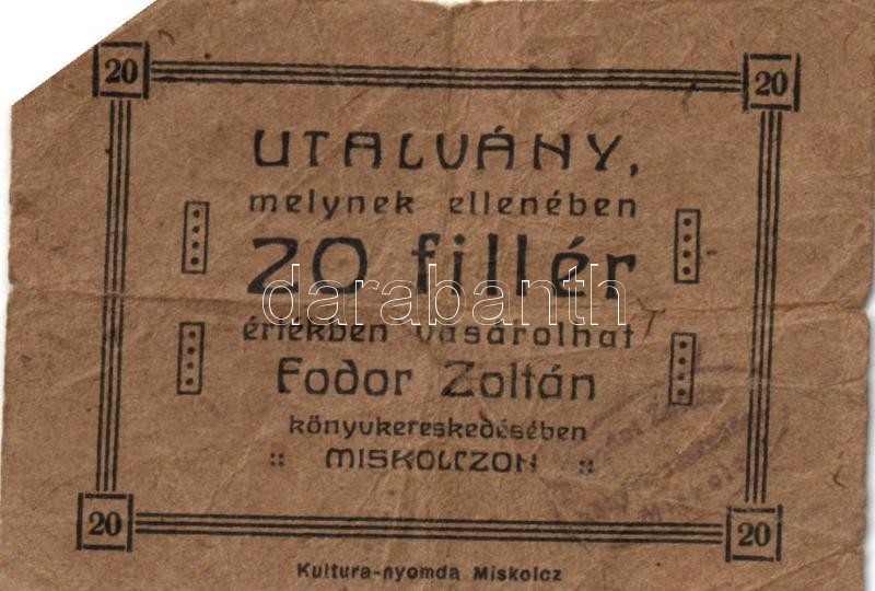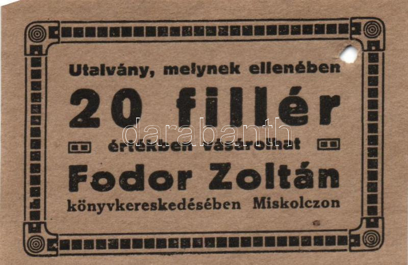 Miskolc 20f utalvány "Fodor Zoltán Könyvkereskedés" (2x) kétféle változat, egyik felülbélyegezve T:II(lyukas),III