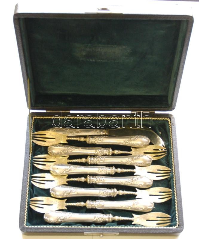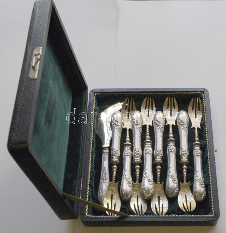 Description: Nagyon szép növényi ornamentika vésettel ellátott ezüst(Ag) villa készlet(8db) és 1db hozzátartozó kés díszdobozban, összesen 426g / Very nice set of plant ornament engraved silver(Ag) forks (8pcs) and one knife, total weight 426g