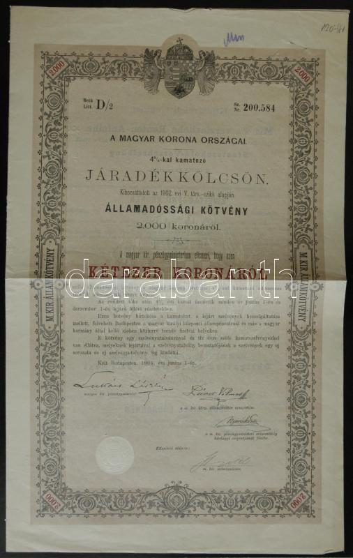 https://www.darabanth.com/en/155-Online-auction/155.0/Numismatics/Shares-Securities-and-Tickets~5000344/1903-Magyar-Korona-Orszagai-425-kal-kamatozo-Jaradekkolcson-allamadossagi-kotvenye-2000K-~II485551