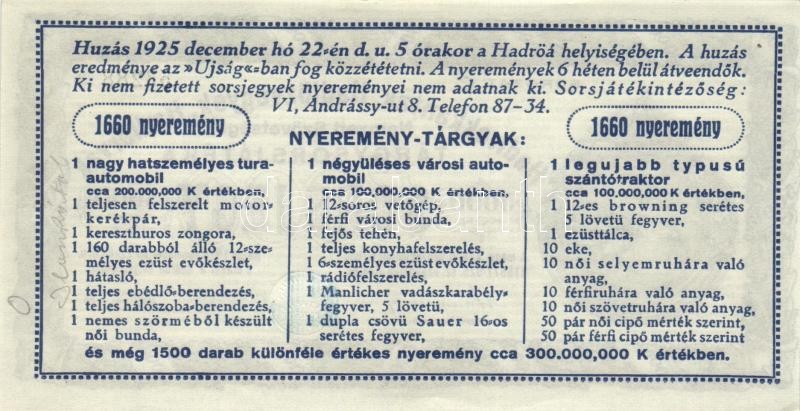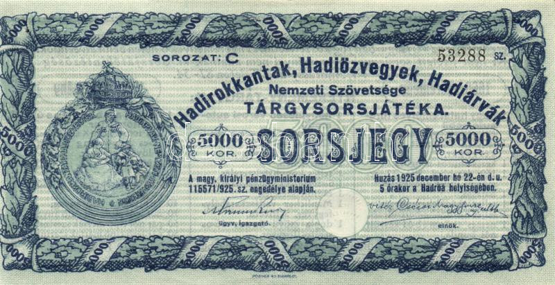 1925. Hadirokkantak, Hadiözvegyek, Hadiárvák Nemzeti Szövetsége Tárgysorsjátéka-sorsjegy 5000K T:I-