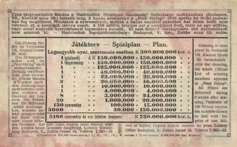 1926. "Sorsjegy a Hadviseltek Üdülő Otthona javára" 10.000K értékben T:III+