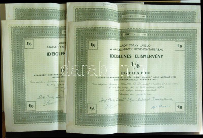 Description: 1927. "Gróf Csáky László Ajax-Acélművek Részvénytársaság" ideiglenes elismervénye 1/6 teljesen befizetett részvényről (4x) közte egymás utáni sorszámmal is