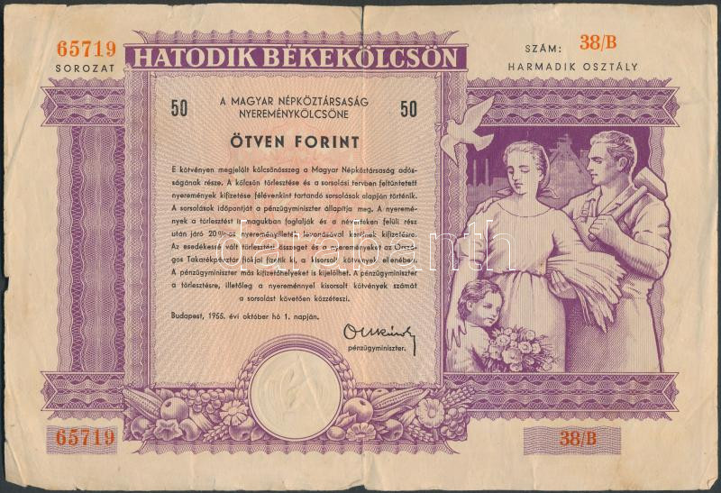1955. "Hatodik Békekölcsön" nyereménykölcsöne 50Ft-ról szárazpecséttel (kis papírszakadások)