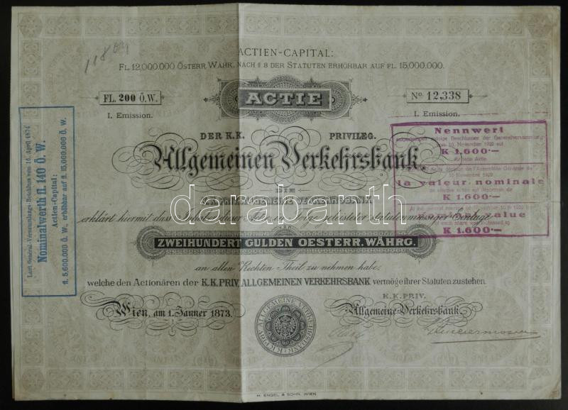 Ausztria 1873. Általános Közlekedési Bank részvénye 200G-ről felülbély... https://www.darabanth.com/en/155-Online-auction/155.0/Numismatics/Shares-Securities-and-Tickets~5000344/Ausztria-1873-Altalanos-Kozlekedesi-Bank-reszvenye-200G-rol-felulbelyegezve-3Cbr3EAustria-1~II485844
