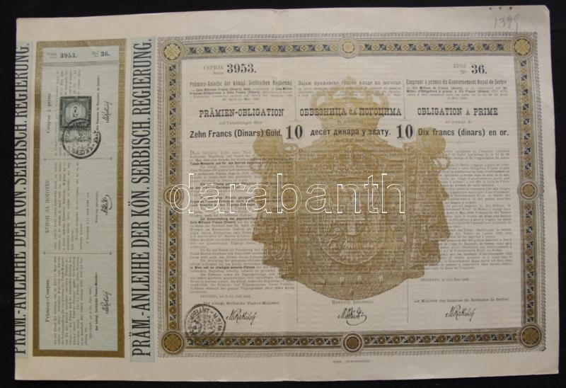 Szerbia/Belgrád 1888. Prémium Kötvény 10 arany Dénárról három nyelven