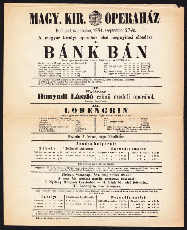 1884 A M. kir. Operaház nyitó előadásának kisméretű plakátja 18x23 cm