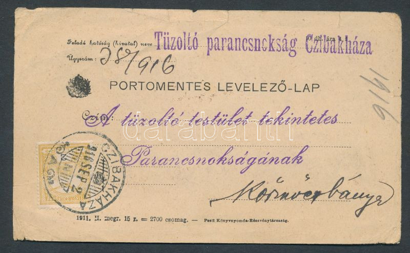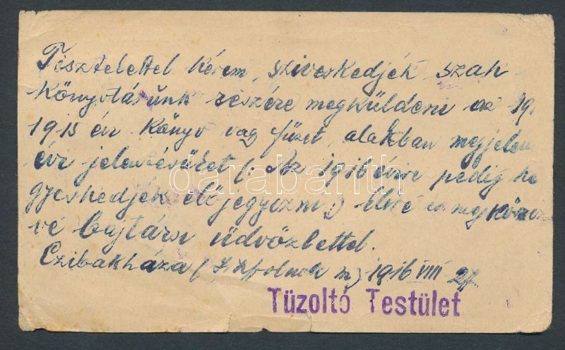 1916 A Cibakházi Tűzoltó Parancsnokság által küldött levelezőlap