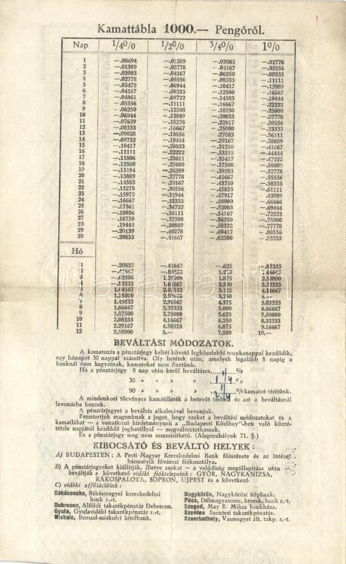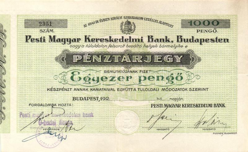 Budapest 1941-44. A Pesti Magyar Kereskedelmi Bank pénztárjegye 1000P-ről T:II-