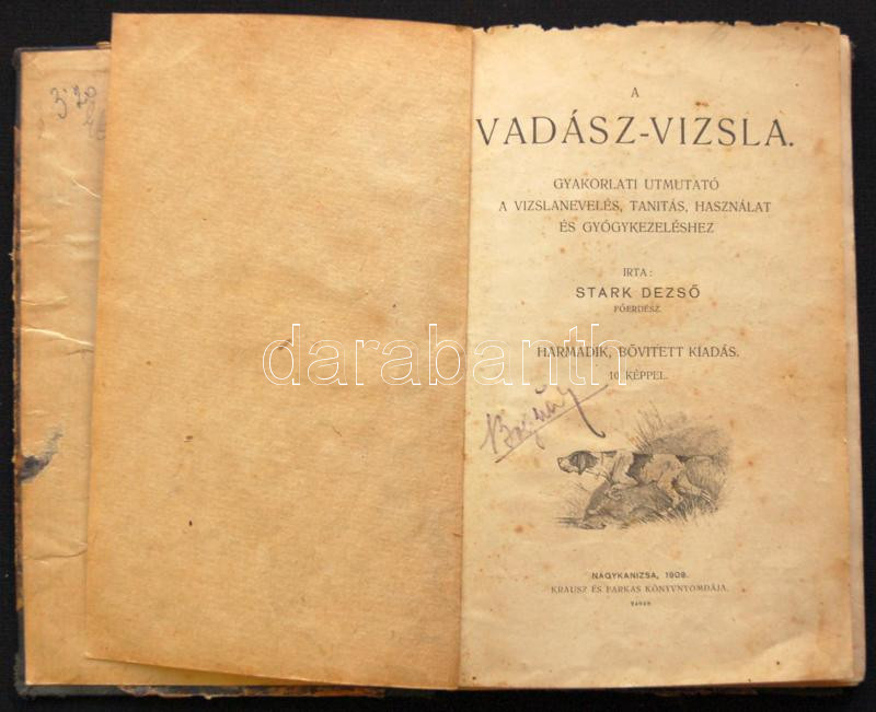 Description: Stark Dezső: A vadász-vizsla- Gyakorlati útmutató a vizslanevelés , tanítás, használat és gyógykezeléshez. Nagykanizsa 1909. Harmadik, bővített kiadás, 10 rézkarc képpel illusztrálva 62p.