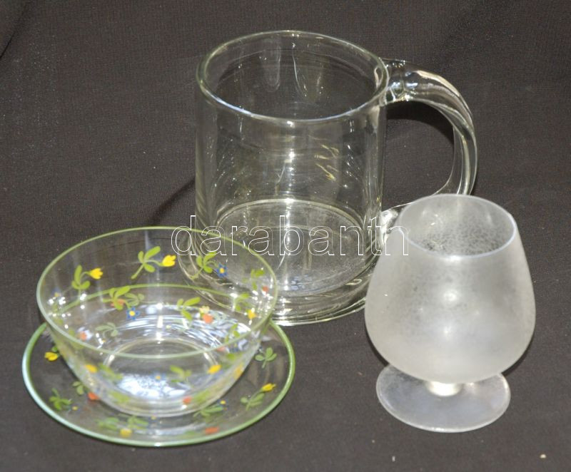 Kis üveg tétel: pohár, festett tányér tálkával, korsó