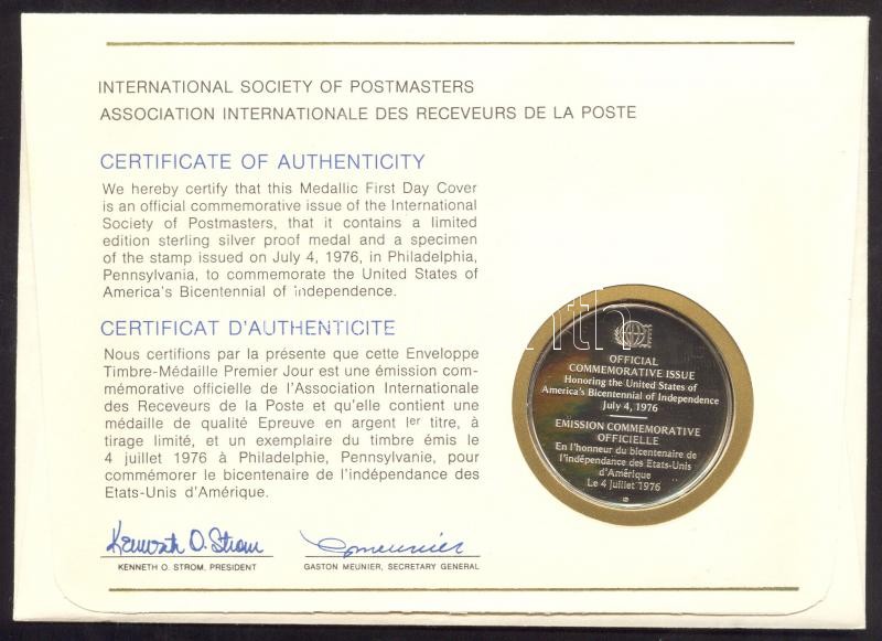 USA 1976. "Bicentennial of Independence" Ag(925) medallion (20g) / International Society of Postmasters - Medallic First Day Cover with Dutch information C:PP
