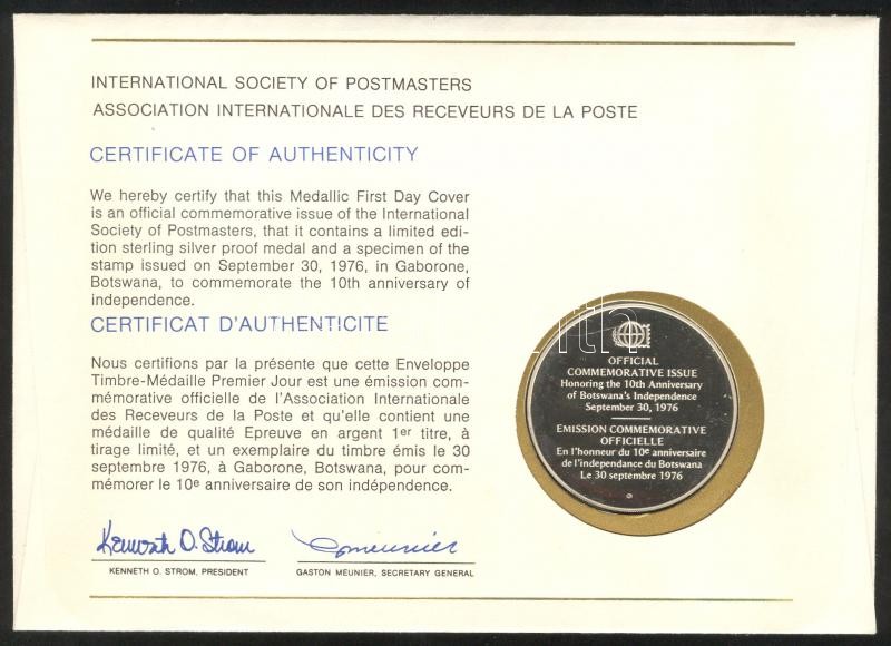 Botswana 1976. "10th Anniversary of Independence" Ag(925) medallion (20g) / International Society of Postmasters - Medallic First Day Cover with Dutch information C:PP