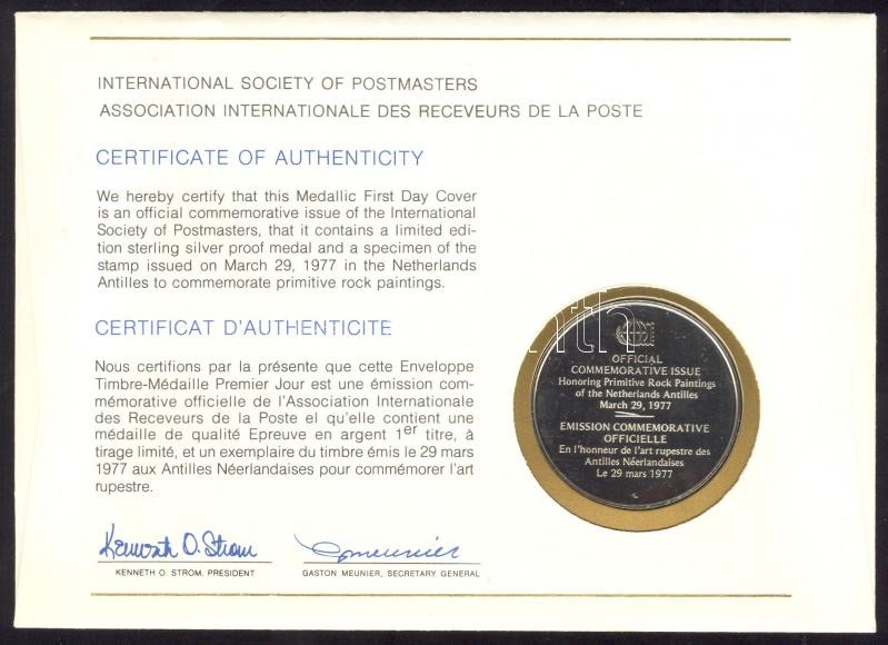 Netherlands Antilles 1977. "primitive rock paintings" Ag(925) medallion (20g) / International Society of Postmasters - Medallic First Day Cover with Dutch information C:PP