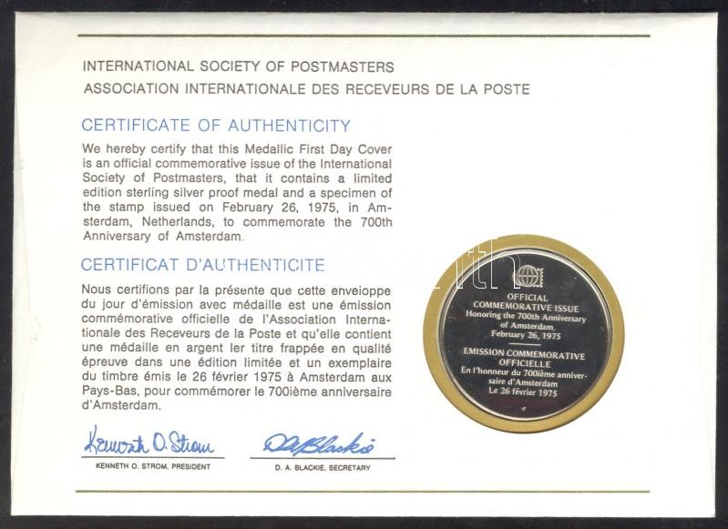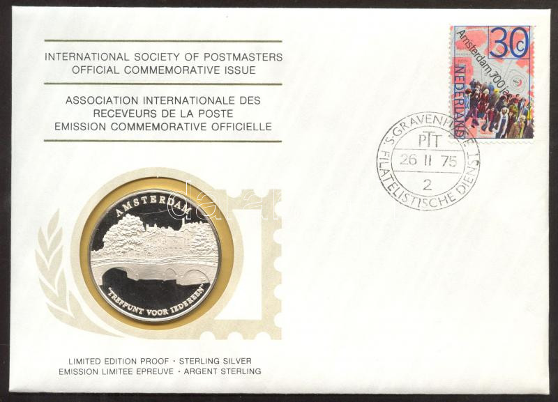 Description: Hollandia 1975. "Amsterdam 700 éves" a Postamesterek gondozásában kiadott Ag(925) emlékérem 20g érmés, bélyeges borítékon, holland bélyeggel, elsőnapi bélyegzővel, holland nyelvű ismertetővel T:PP