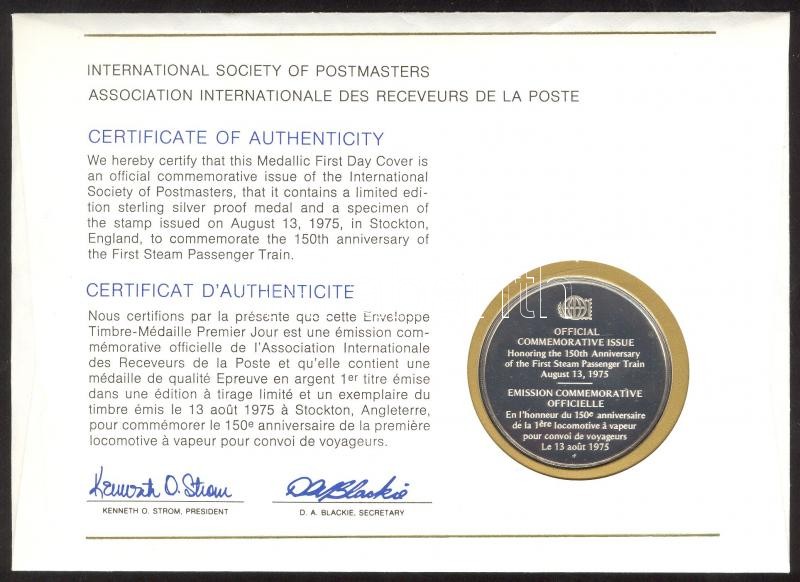 Great Britain 1975. "Stephenson´s Steam Passenger Train" Ag(925) medallion (20g) / International Society of Postmasters - Medallic First Day Cover with Dutch information C:PP