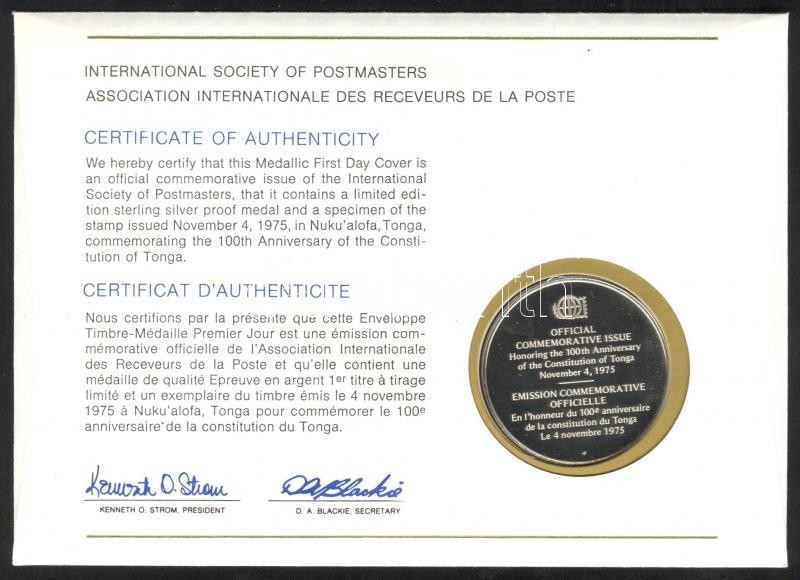 Tonga 1975. "100th Anniversary of the Constitution of Tonga" Ag(925) medallion (20g) / International Society of Postmasters - Medallic First Day Cover with Dutch information C:PP