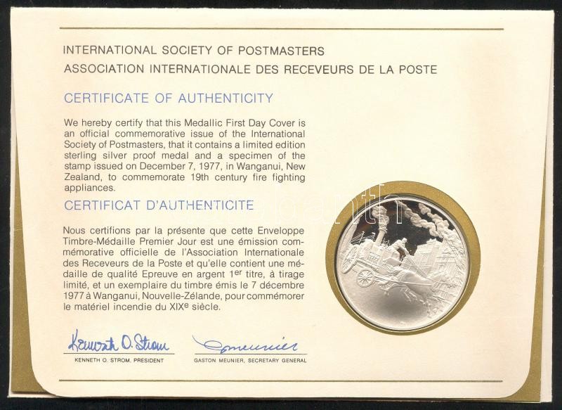 New Zealand 1977. "19th century fire fighting appliances" Ag(925) medallion (20g) / International Society of Postmasters - Medallic First Day Cover with Dutch information C:PP