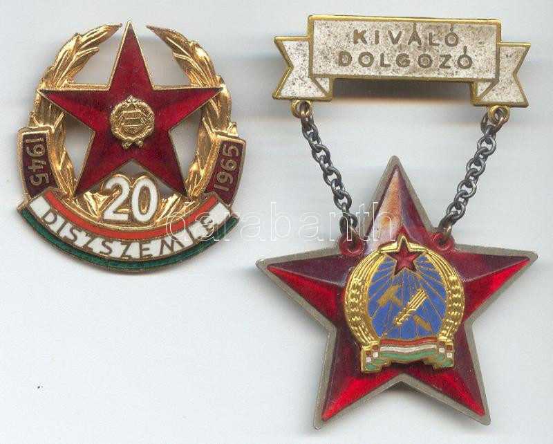 https://www.darabanth.com/en/158-Online-auction/158.0/Numismatics/Faleristics-medals-orders-badges~600110/1950-es-evek-Kivalo-Dolgozo-kituntetes-Rakosi-cimerrel-T2-plus-1965-Diszszemle-zomancoz~II489681