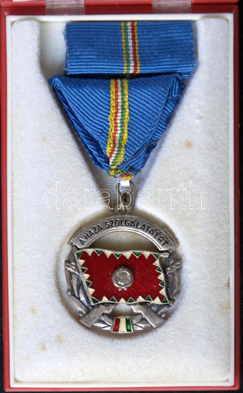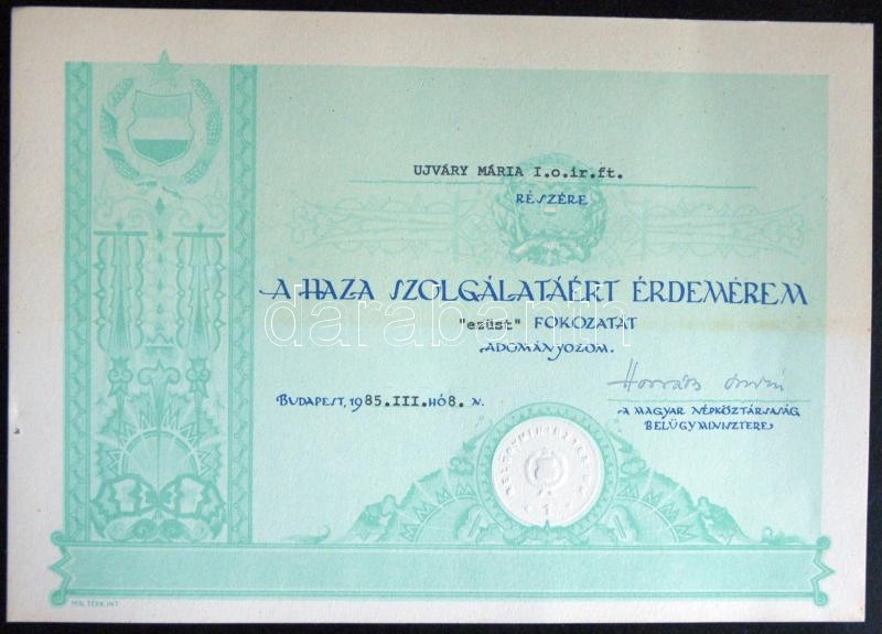 https://www.darabanth.com/en/158-Online-auction/158.0/Numismatics/Faleristics-medals-orders-badges~600110/1985-A-Haza-Szolgalataert-Erdemerem-ezust-fokozata-disztokban-es-adomanyozoi-okirattal-~II488318