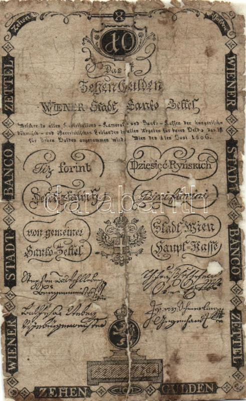 https://www.darabanth.com/en/158-Online-auction/158.0/Numismatics/Hungarian-Banknotes~600103/1806-10G-Becsi-varosi-bankocedula-TIV-restauralt~II502451