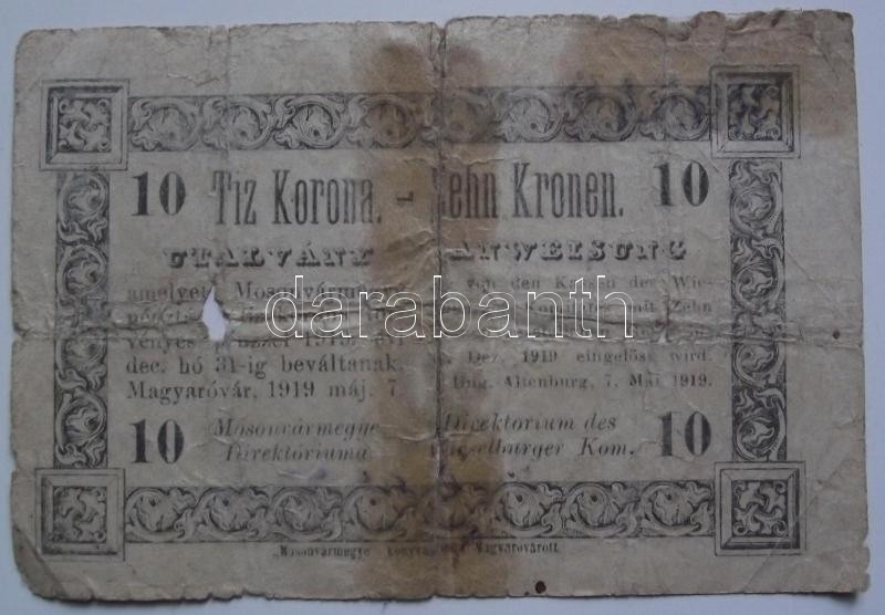 https://www.darabanth.com/en/158-Online-auction/158.0/Numismatics/Hungarian-and-foreign-emergency-notes-and-coins-tokens~600102/Magyarovar-Mosonvarmegye-Direktoriuma-1919-10K-TIV~II503746