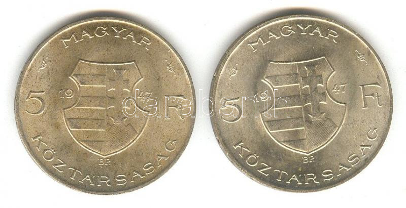https://www.darabanth.com/en/158-Online-auction/158.0/Numismatics/Hungarian-metal-and-silver-coins~600104/1947-5Ft-Ag-Kossuth-2x-T2-ph~II499333