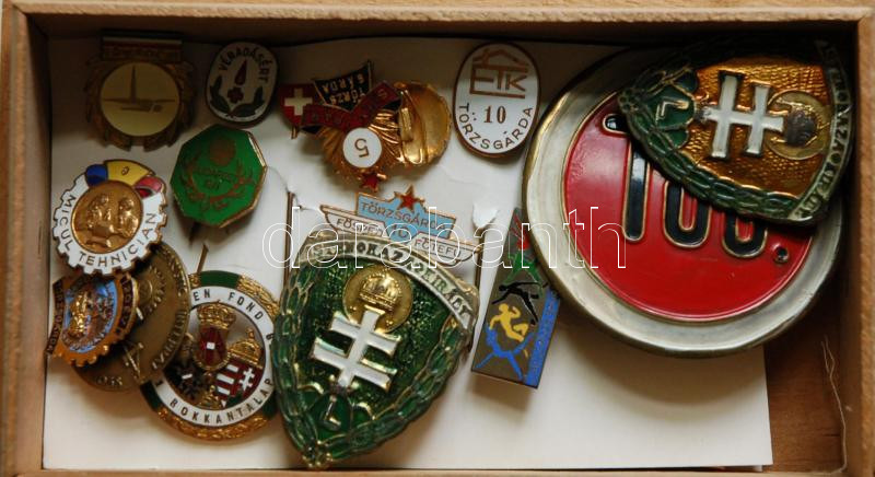 18db különféle jelvény, kitűző, plakett kis fadobozban, közte zománcoz...