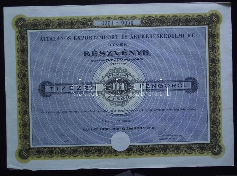 https://www.darabanth.com/en/158-Online-auction/158.0/Numismatics/Shares-Securities-and-Tickets~600101/Budapest-1944-Altalanos-Export-Import-Arukereskedelmi-RT-reszvenye-10000P-ertekben-szelv~II503105