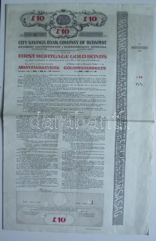 Description: Budapest ~1925. "Belvárosi Takarékpénztár Részvénytársaság" aranyzáloglevele 10Ł értékben angol és magyar nyelven, szelvényekkel, szárazpecséttel, lyukasztással érvénytelenítve T:II-