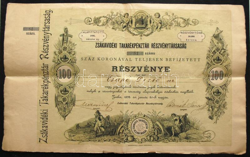 https://www.darabanth.com/en/158-Online-auction/158.0/Numismatics/Shares-Securities-and-Tickets~600101/Zsaka-1896-Zsakavideki-Takarekpenztar-Reszvenytarsasag-reszvenye-100K-rol-szelvenye~II501988