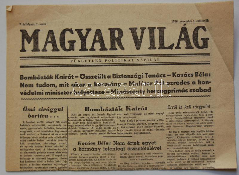 https://www.darabanth.com/en/158-Online-auction/158.0/Other-collectibles/Historical-documents-manuscripts~177/1956-november-1-Magyar-Vilag-Fuggetlen-Polirikiai-Napilap-I-evf-1szam-Benne-a-forradalom-~II498445