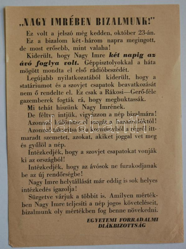 1956 október 29. Az Egyetemi Forradalmi Bizottság nyomtatványa: "Nagy Imrében bizalmunk"