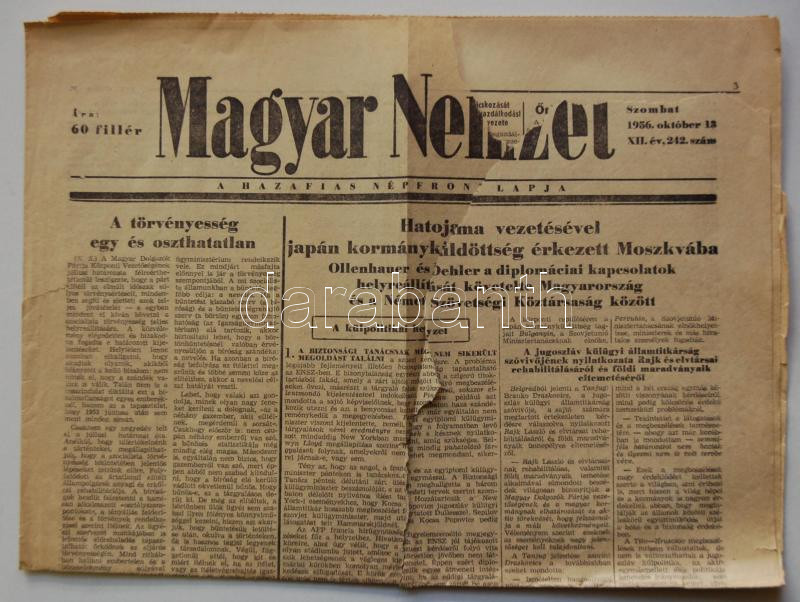 1956.október 13. A Magyar Nemzet. XII. évf. 242.szám, a szocialista törvényesség helyreállításáról szóló MDP nyilatkozattal, Farkas Vladimir és társa elleni perről szóló cikkel, szakadással