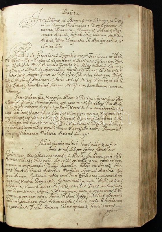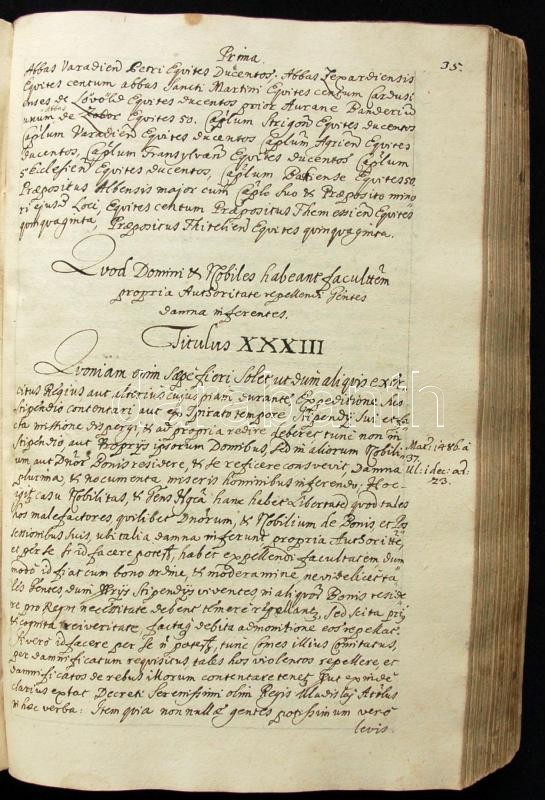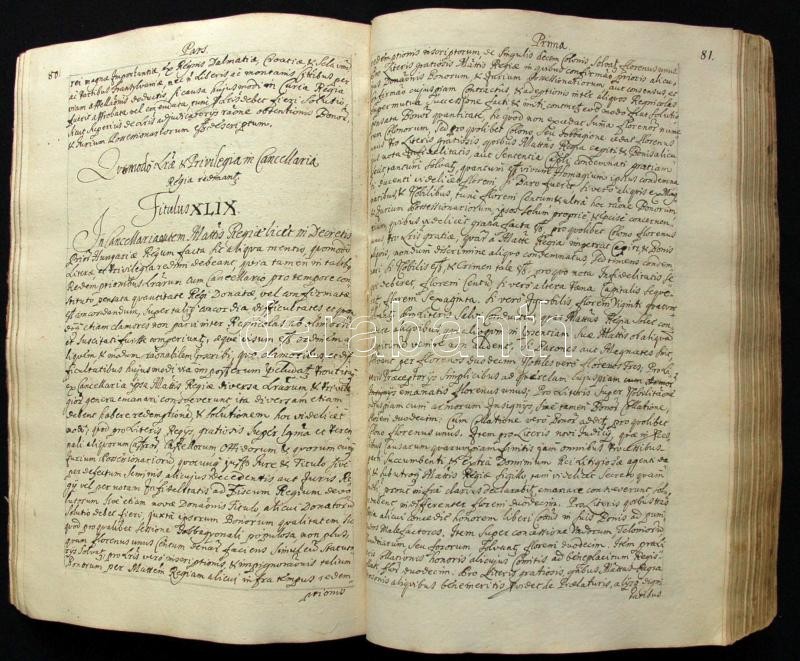 cca 1650 Novoszel Antal-Werbőczy István: Négyeskönyv (Quadripartium) a Werbőczy-féle Hármaskönyv (Tripartium) bővített változata latinul. 646 kézzel beírt oldal tárgymutatóval, tartalomjegyzékkel. A vízjelek alapján a Felvidéken íródott. Megviselt félbőr kötésben, ázás-nyommal. /